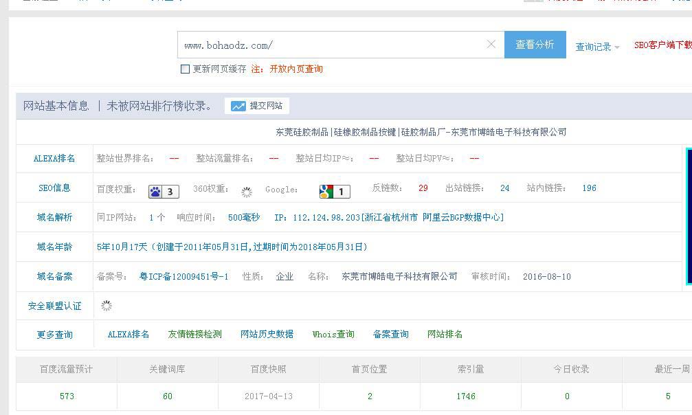 今天早上小編查詢博皓電子官網(wǎng)的站長(zhǎng)的SEO數(shù)據(jù),發(fā)現(xiàn)一個(gè)不小的驚喜,那就是博皓電子(m.haliyikamakagithane.com)官網(wǎng)百度權(quán)重到3了。之前小編一直在心中提問(wèn),硅膠制品行業(yè)的官網(wǎng)可以優(yōu)化到3不?當(dāng)時(shí)心中是認(rèn)為不太可能的,今天也終于實(shí)現(xiàn)了。
