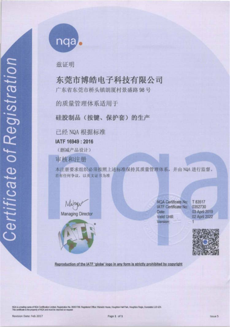 2018年IATF 16949的認(rèn)證,讓博皓硅膠制品廠內(nèi)部的各個環(huán)節(jié)全部按體系標(biāo)準(zhǔn)進(jìn)行作業(yè),本來就把品質(zhì)和客戶滿意度放在第一位的我們,可以更自信的和客戶說我們做出來的產(chǎn)品您可以放心。