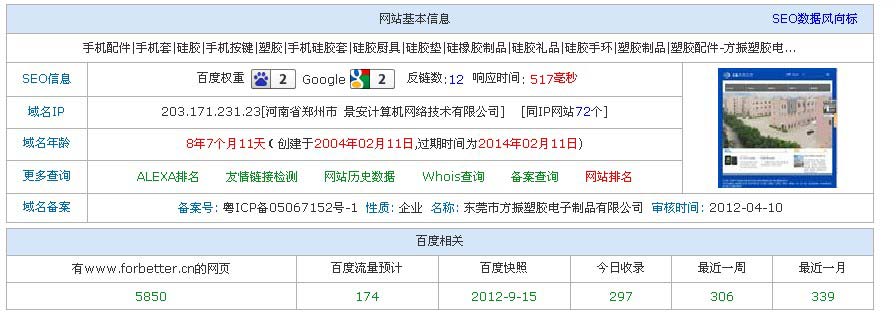 東莞博皓電子是今年上線的,正式的優(yōu)化花費了大概有3個月時間,計劃中的幾個有目標關(guān)鍵詞現(xiàn)在都排名第一了,接下來的三個月是將熱門關(guān)鍵詞硅膠、硅橡膠、按鍵優(yōu)化到百度首頁的前5名,外鏈做的比較好,網(wǎng)站的設(shè)計在整個硅膠行業(yè)的企業(yè)網(wǎng)站里面應(yīng)該可以說是好的,缺點是上線不久,還處于百度的沙盒效應(yīng)中,導致收錄數(shù)量很差,后期可能會有排名不穩(wěn)定的現(xiàn)象。